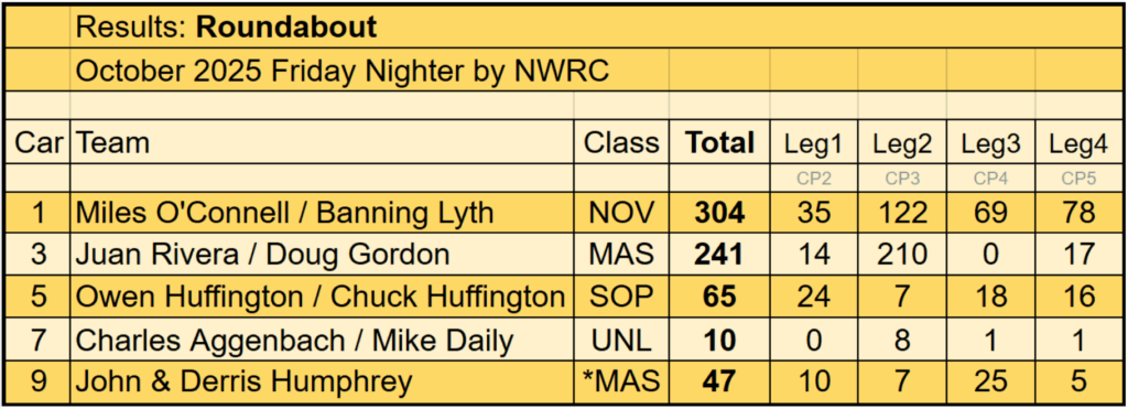 * John and Derris had helped checkout the route and instruction previously, making them ineligible to compete in the event. They still entered (running last) to support the NWRC. Their score was ignored in final results.